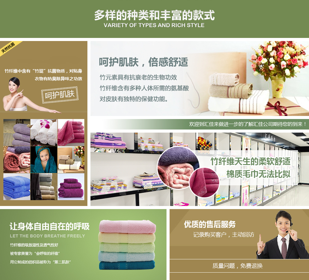 德州匯佳紡織品有限公司專業生產竹纖維毛巾,是竹纖維毛巾品牌廠家,并且提供竹纖維毛巾禮盒套裝用于福利和禮品。公司座落于山東德州,交通十分便利,公司近臨京滬高速公路,距離德州火車站、汽車站10公里京滬高鐵5公里,濟南國際機場120公里。